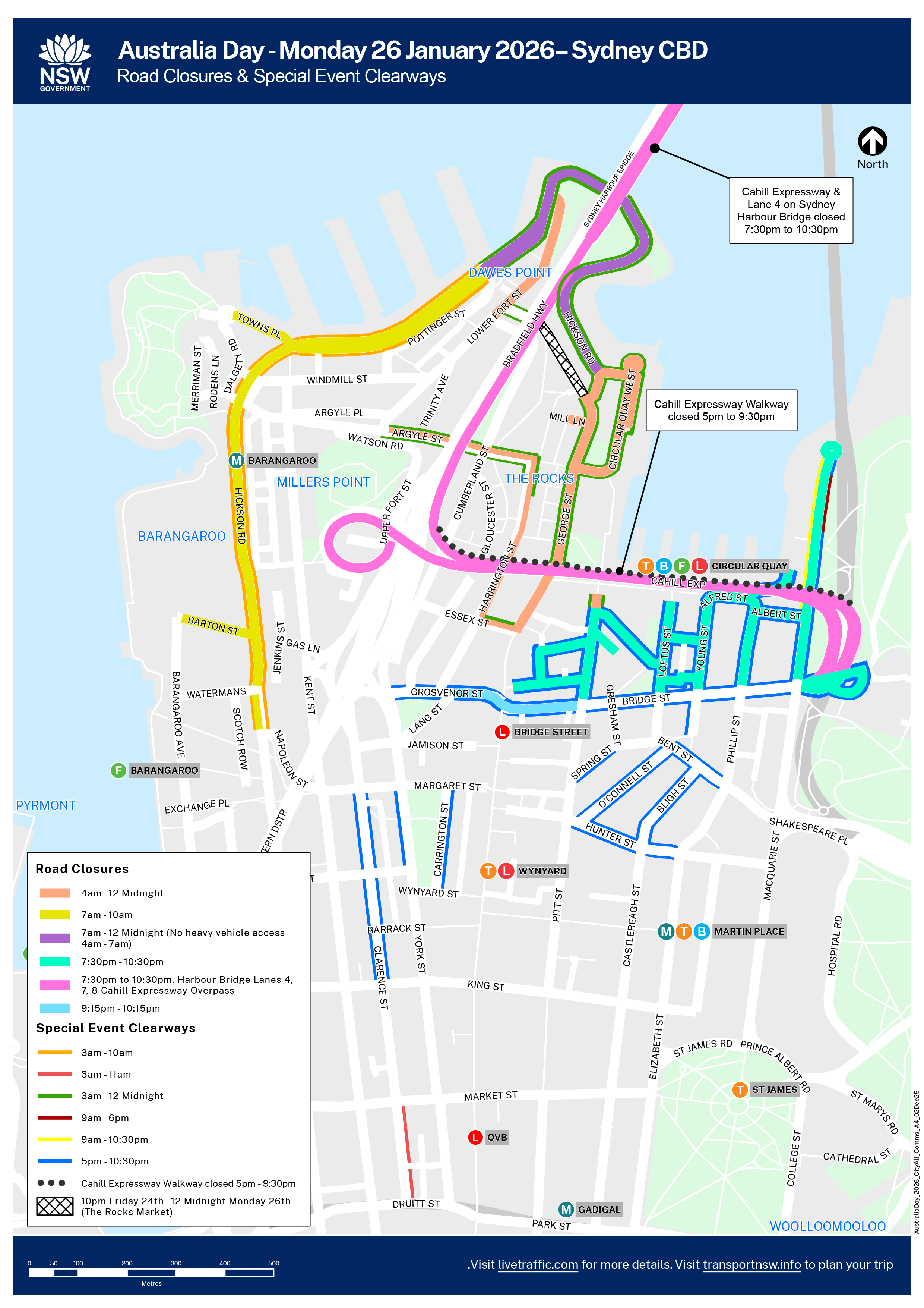 Road closures and Special Event Clearways (SEC) will be in place on Monday 26 January 2026 in the Sydney CBD, The Rocks, Dawes Point, Millers Point, Barangaroo, and Milsons Point for Australia Day in Sydney.