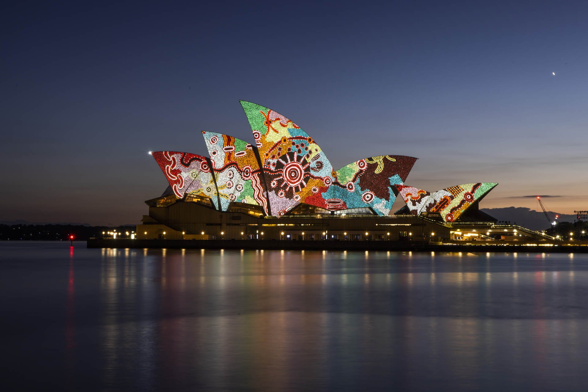 In the soft light before sunrise, a beautiful piece of Aboriginal art illuminates the sails of the Sydney Opera House, reflecting in the waters of our timeless harbour.