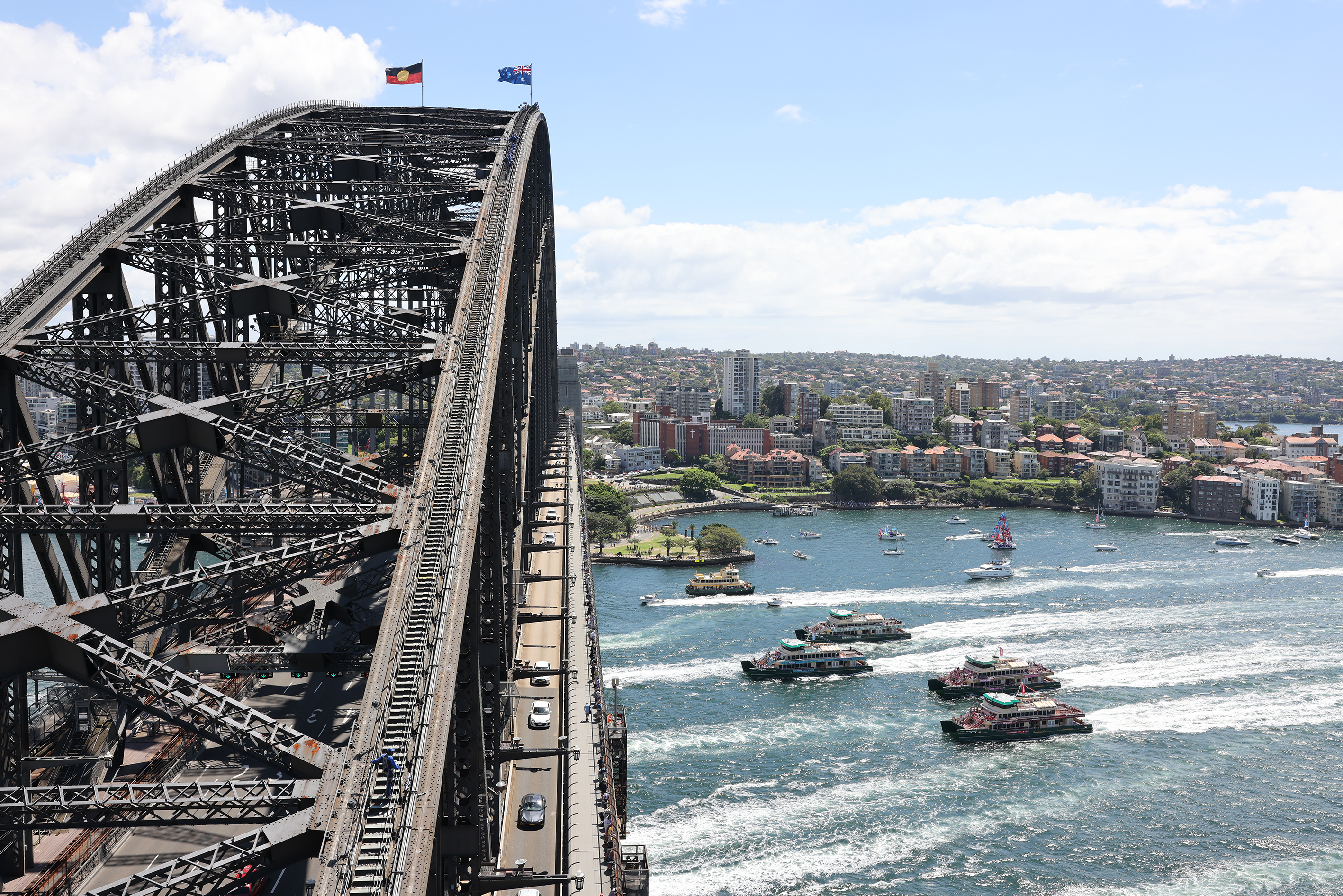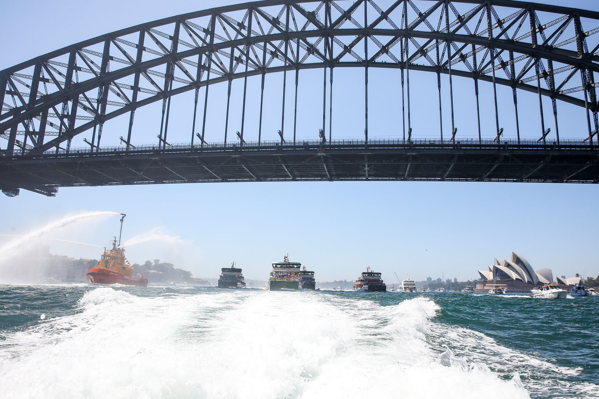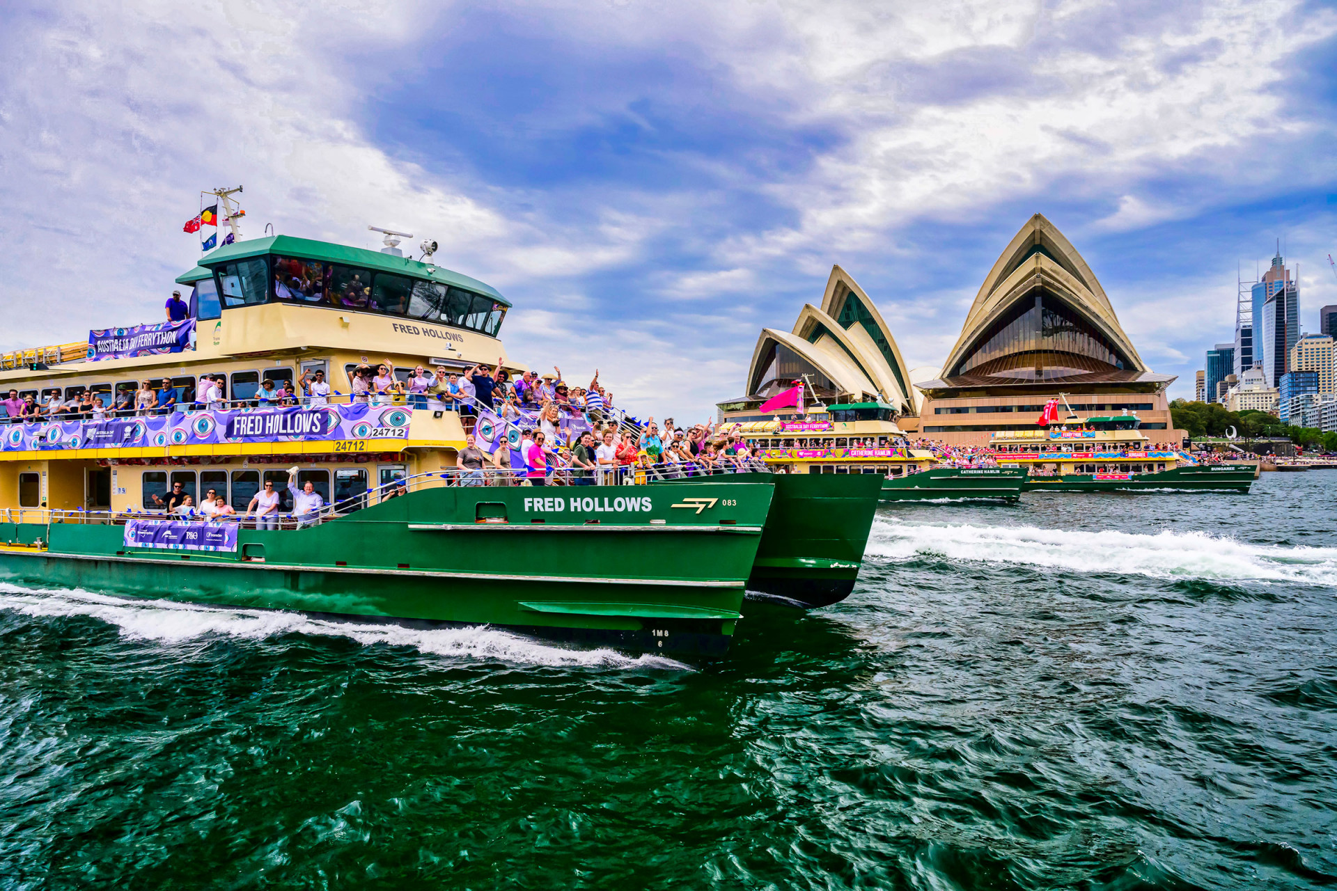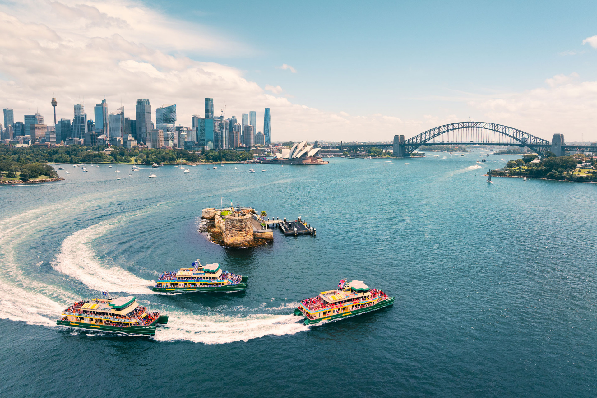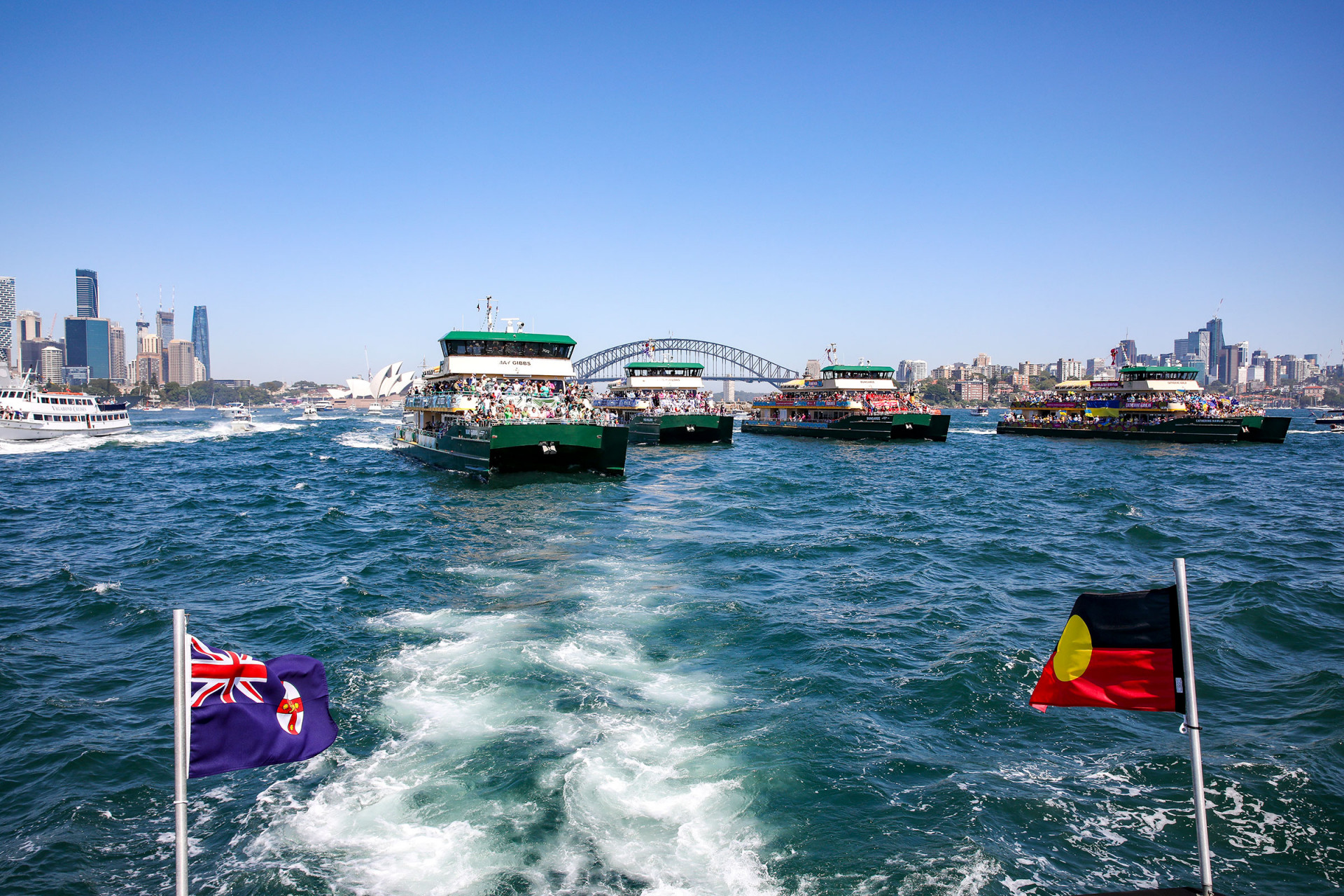 This is no ordinary race. Four of Sydney’s beloved Emerald Class ferries go bow-to-bow, surging across the harbour toward the ultimate finish line – the Sydney Harbour Bridge.